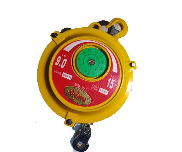 Spring Balancers - are most scientifically designed for suspending and balancing the object , at required height. Working on the principle of Coiled spring, it ensures constant tension throughout the entire cable travel, to ensure fatigueless operation. Manufactured from High grade Aluminium casting, it is compact in design and light in weight. With Forged swivel top hook for 360 deg. Rotation, it has built-in safety locking mechanism, to prevent any unforeseen accident, due to spring failure. Salient Features: - Specially designed to free the operator from the weight of hand tools, thereby reducing operator fatigue. - Allows easy handling, as the weight of the loaded balancers and pressure required for operation is counter balanced in the containerized (main) spring mechanism of the spring balancers itself. - Provides maximum impact resistance due to the rugged construction of spring balancer (as main housing and cover plate are manufactured from high tensile lightweight aluminium alloy. - Ensures maximum safety due to forged steel upper support hook and bottom suspension hook assemblies. - Good flexibility and fall safety as a result of cables made using standard flexible wire rope . - Unique, tapered cable drum design that matches the middle turns of spring balancers where the optimum torque build-up is constant; provides smooth and even cable tensions throughout the entire cable travel length. - Easily accessible external tension adjustment, using which required tension can be set through a hardened worm form gear system; no special tool required. - Swivel on top hook allows 360° rotation positioning the spring balancers for easiest cable flow; prolongs cable life. - Automatic Drum Lock arrangement to prevent the load from falling in case spring balancer lowers sharply. - Suspended tools can be easily engaged or disengaged using the manual drum lock, making changeover safe, simple and quick; reduces downtime. Applications : Portable Hand Tools, Welder Guns, Spray guns, Short Blast Guns, Drifting Attachments in mines and Quarries, Jute and synthetic bag closing machines, Gauges, Jigs and Fixtures, Pendant Station, Switch Button of Hoists, in case of de-oxidation, water washing of plating work with raising and lowering of work etc. Design : Overhead Spring Balancers are specially designed to free the operator from weight of the hand tools or any other object, which is handled by human, for hours, continuously. When properly balanced by adjusting spring tension, the tools become almost weightless in the hands of the operator and can be moved up and down with very little effort. Advantages: 1. Increases Productivity – Balancers Keep Poised For Action, Minimize Motions Required To Bring Tool From Rest To Work Positions. 2. Extends Tool Life - Balancers Eliminate Pick-Up And Lay Down Wear And Prevent Damage From Dropping. 3. Reduces Operator Fatigue – A Balancer Makes The Heaviest Tool Light As A Feather. Operator Effort Can Be Directed To Controlling The Tool Rather Than Supporting. 4. No Need Of Power – There Is No Need Of Electrical Or Mechanical Power. 5. Increases Safety – Balancers Keep Work Area Uncluttered To Reduce Chances Of Damages Of Accessories Or Accidental Start-Up Of Tools During Handling. 6. Effective Use Of Space – The Working Place Being Widely Utilized, And Also To Be Cleaned Up, The Production Is Smoothly Carried Out.